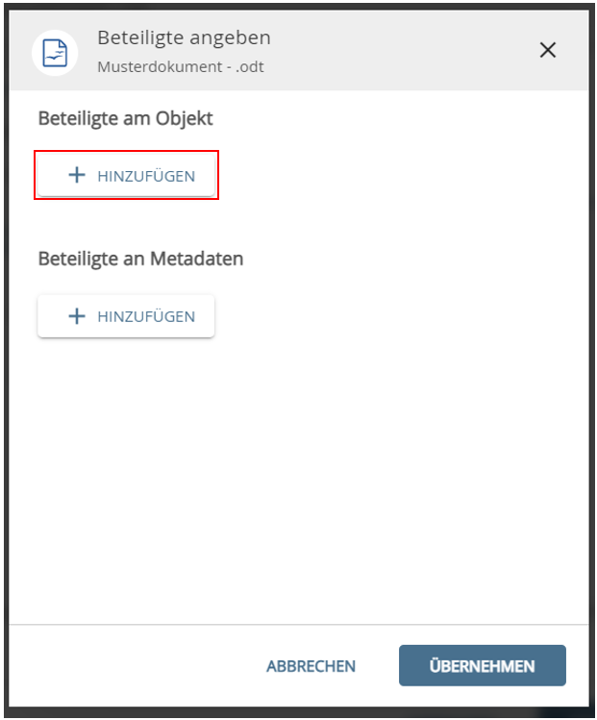 Klicken Sie das Eingabefeld „Hinzufügen“ unter „Beteiligte am Objekt“ an.
